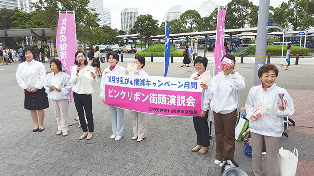 桜木町駅前で、乳がんの検診、セルフチェックなどの啓発チラシを配りながら、街頭演説会を開催しました。手にとって下さる方も多く、皆さんの関心は高いようです。
